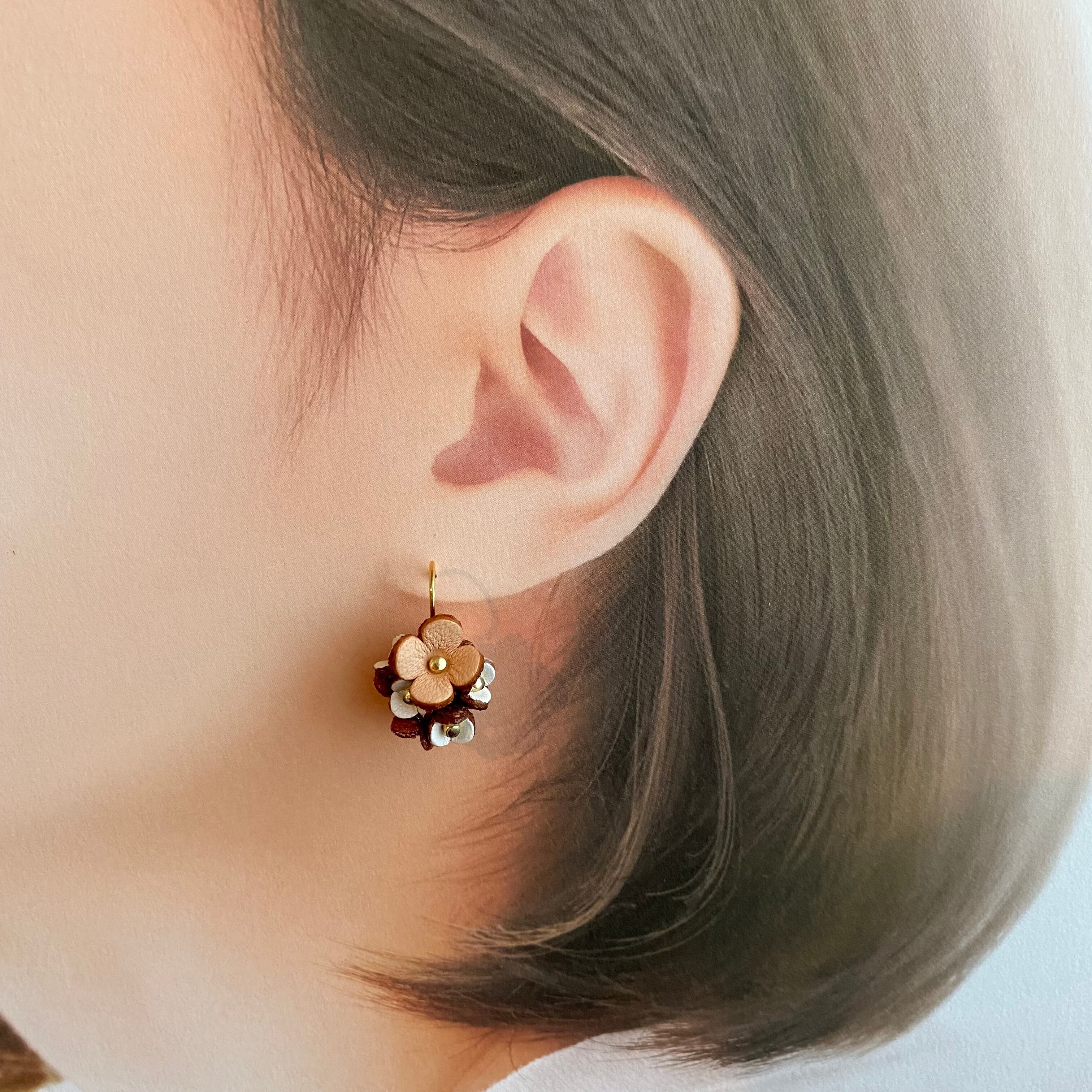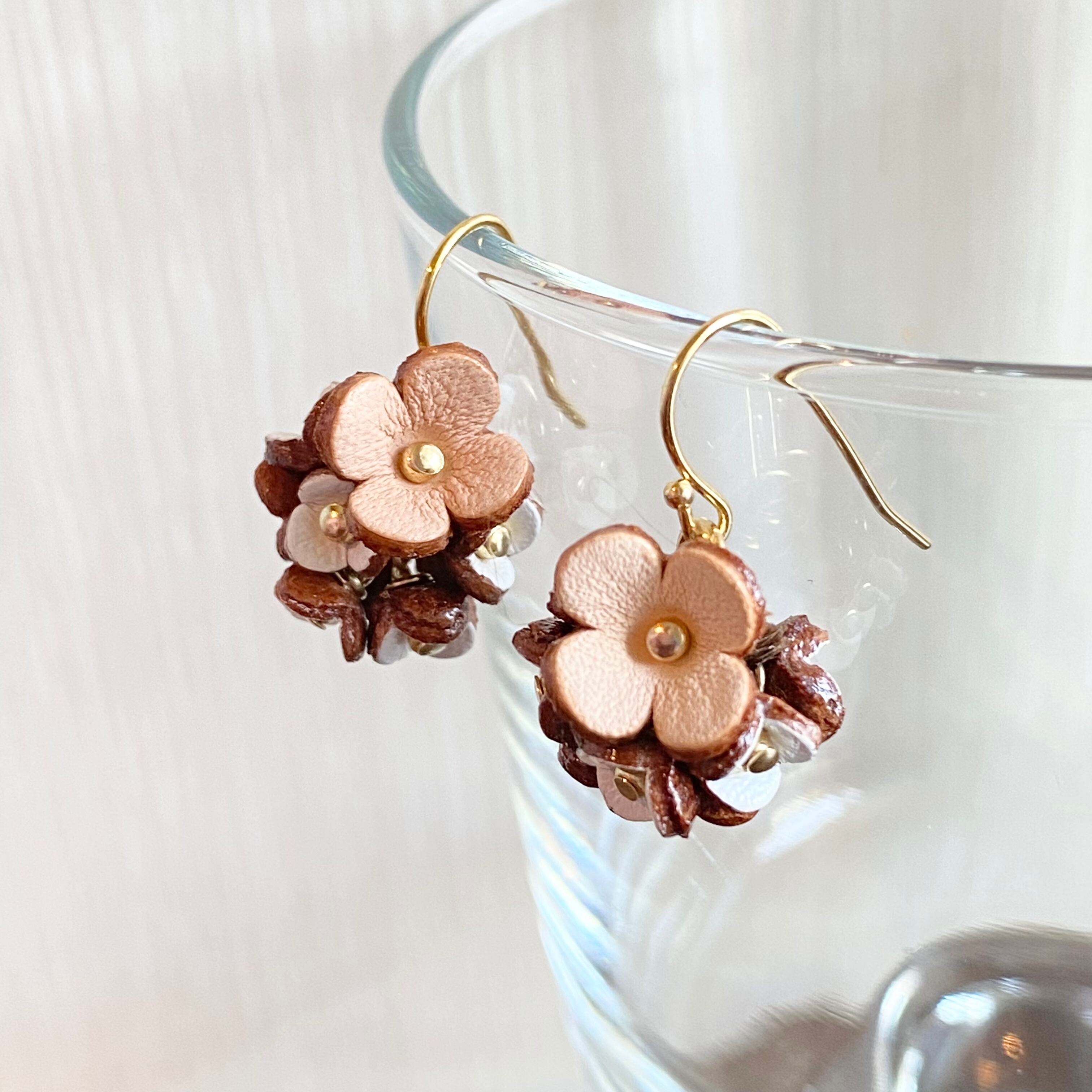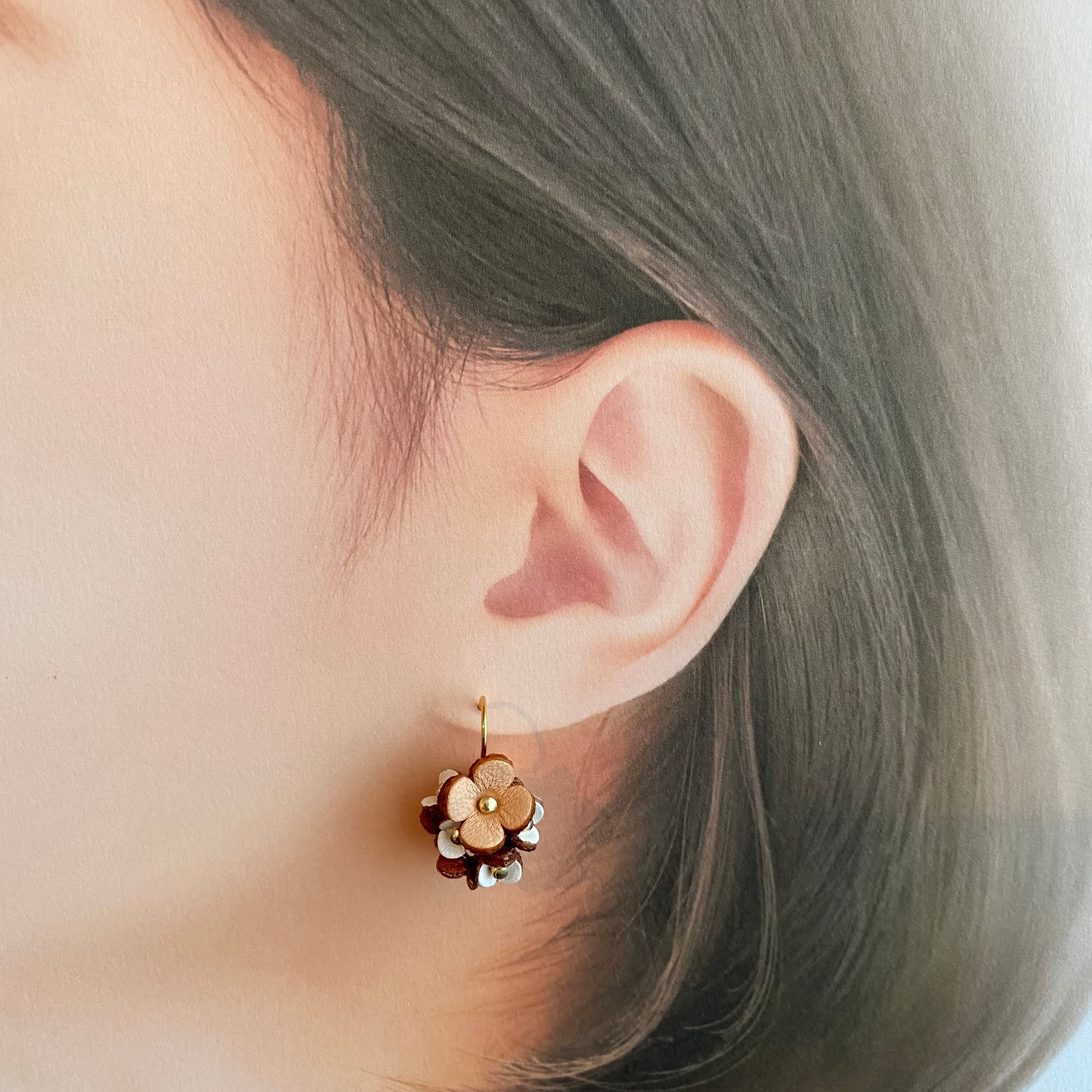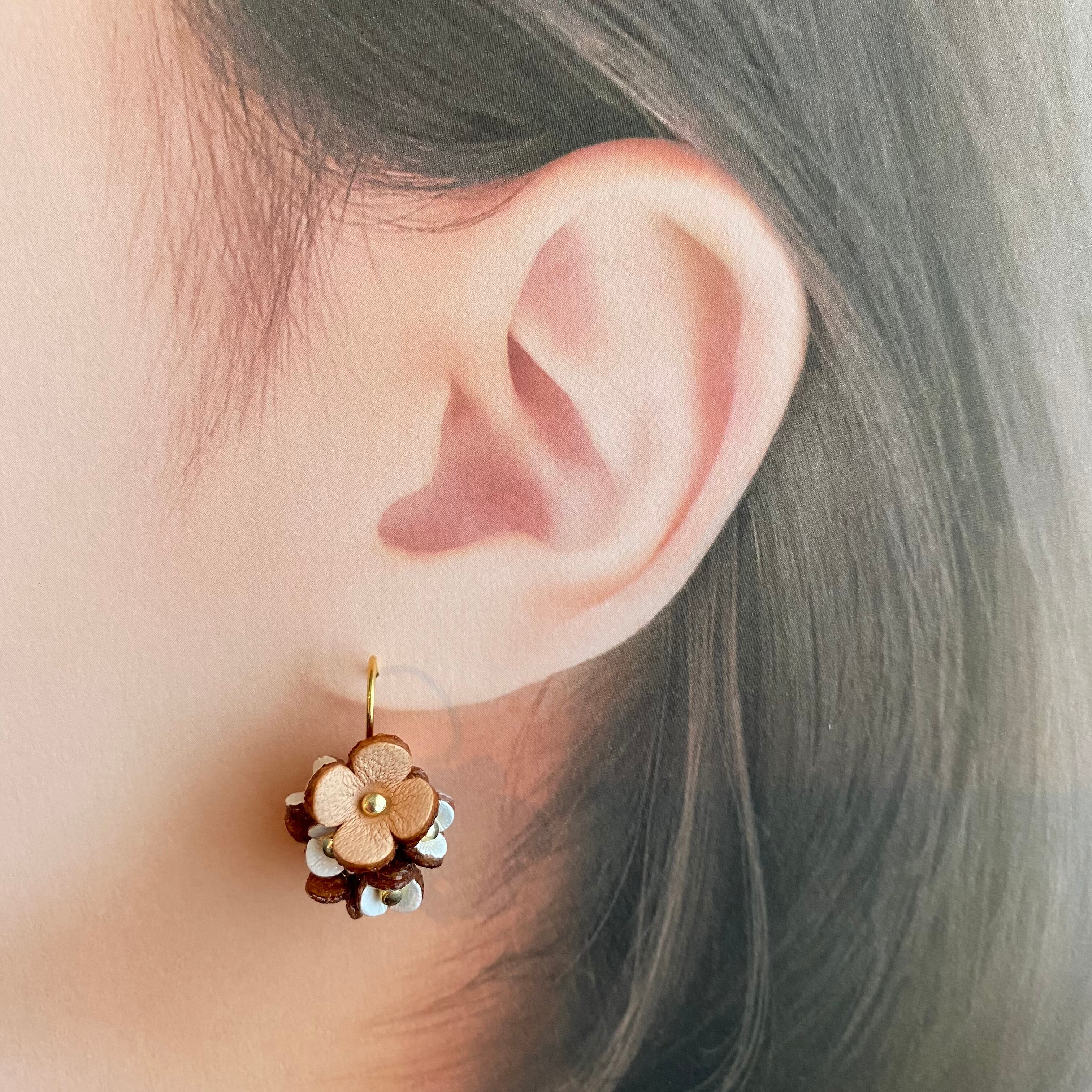 アナベル型のレザーフラワーがアクセントの小花イヤリング/ピアスです。