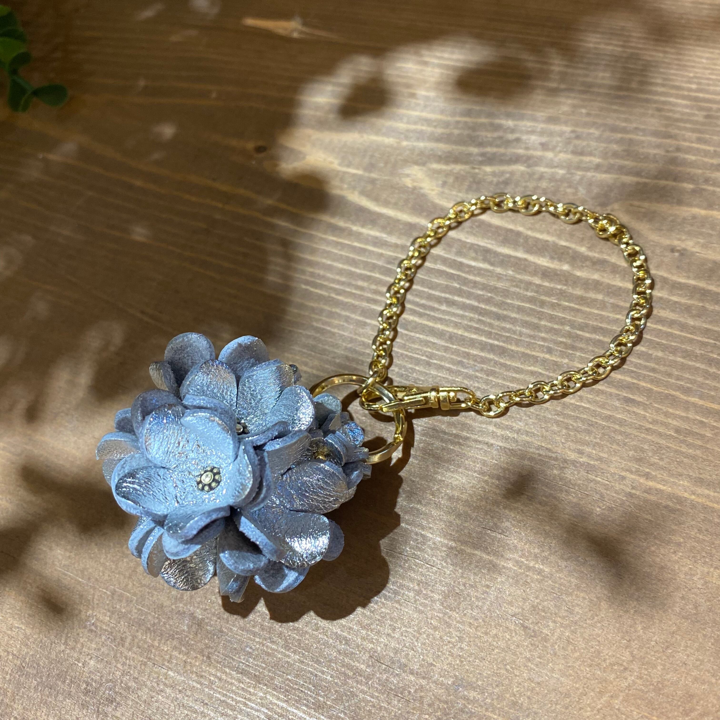 レザーフラワーをふんだんに使った華やかなバッグチャームです。