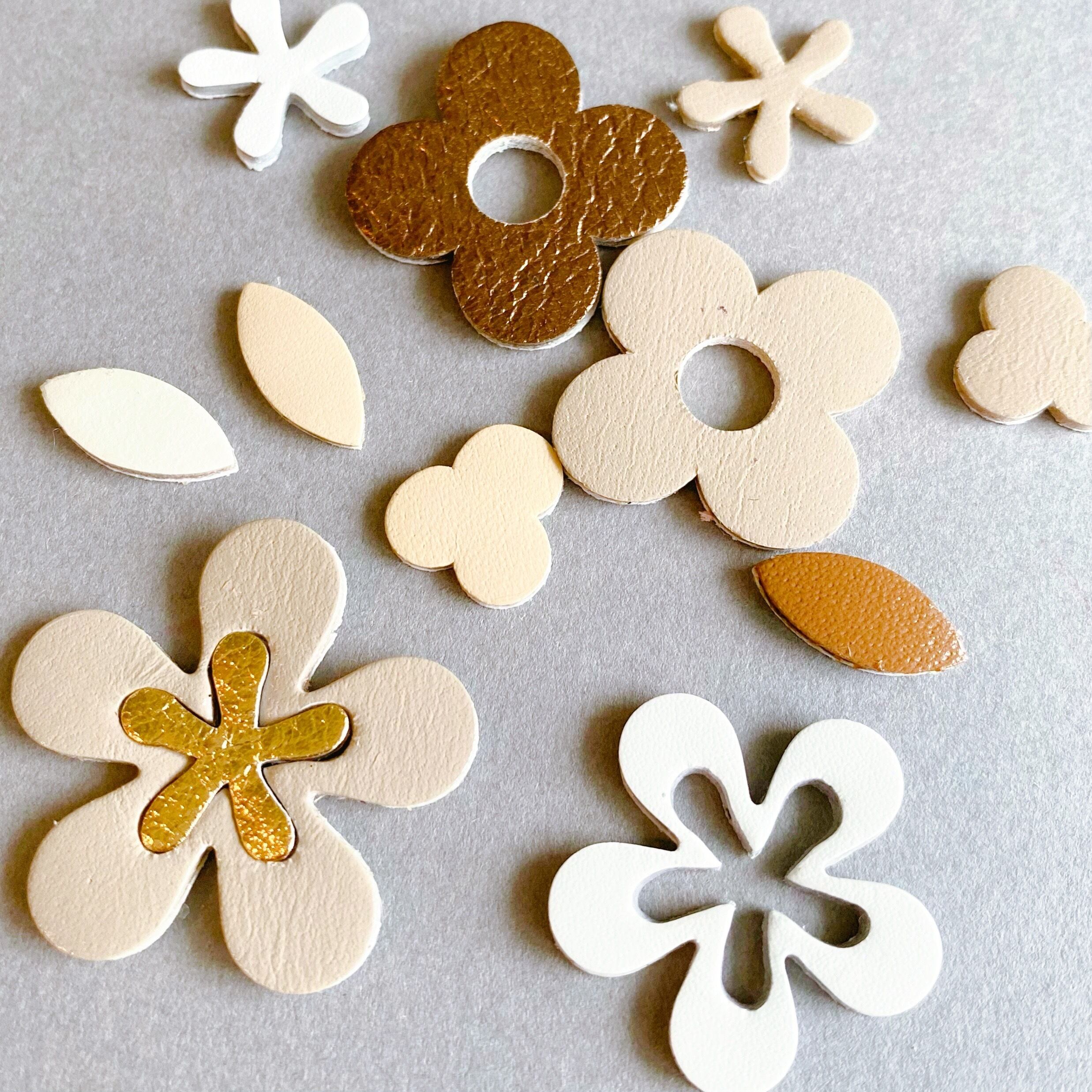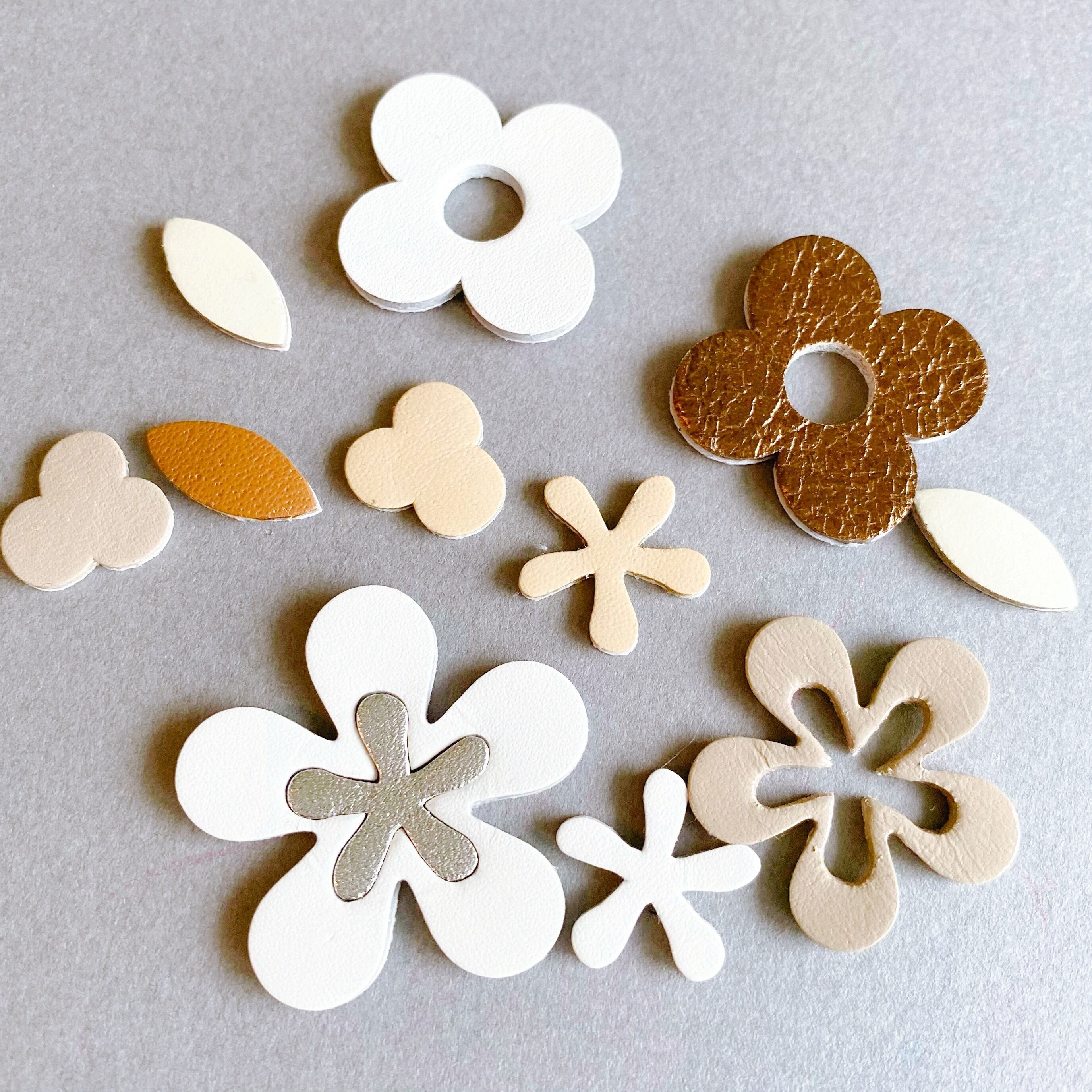 【レザーシール】色々な形が可愛いお花の本革シール12枚入(ブラウンベージュカラー)